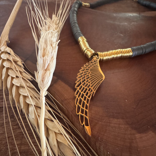 Collar Gris Y Dorado De Cuentas Y Ala De Ángel